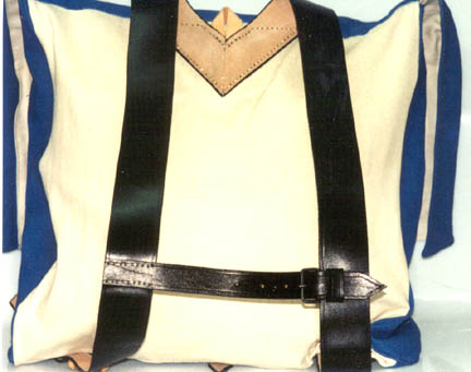 There is a leather strap attached by leather thongs. Three pewter button closer. This knapsack was copied from period drawings.