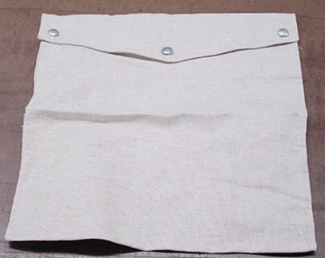 The haversack is white cotton, has a scalloped flap and three pewter buttons. Our is made from fine military drill cloth.