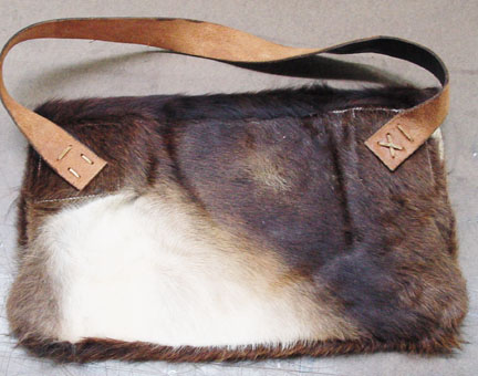 This a leather knapsack with the hair still on the hide. By the hair being left on the leather this helps the knapsack be water proof.