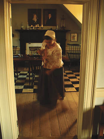 Sweeping the floor, this staff member makes the house come alive in her period attire.